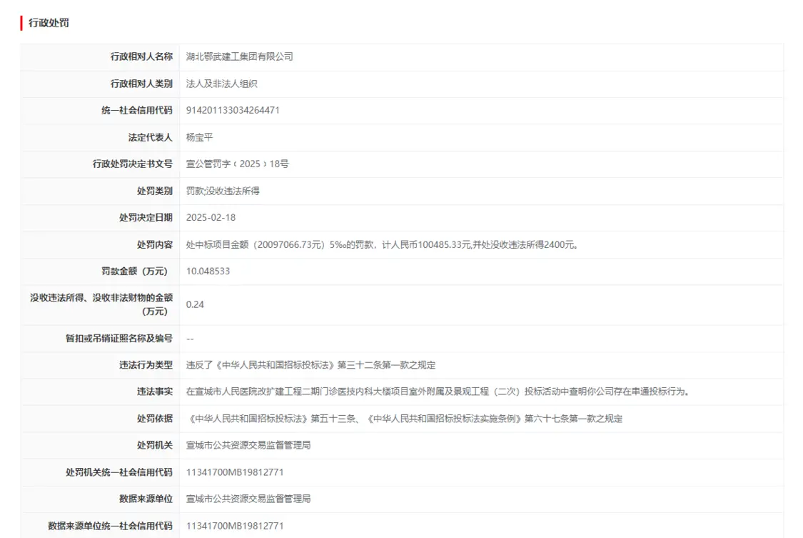 对湖北鄂武建工集团有限公司处中标项目金额(20097066.73元)5‰的罚款,计人民币100485.33元,并处没收违法所得2400元;