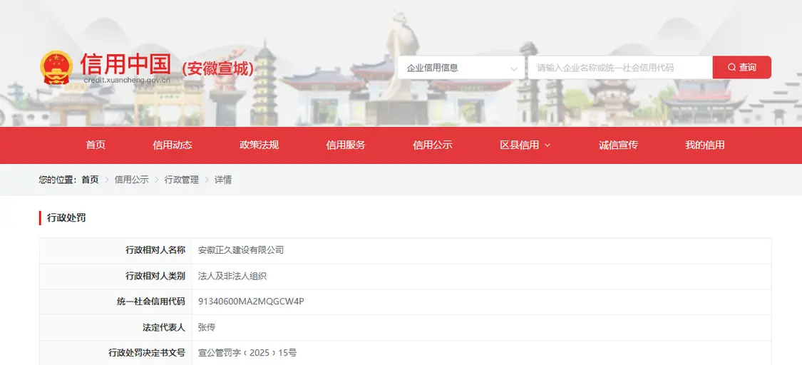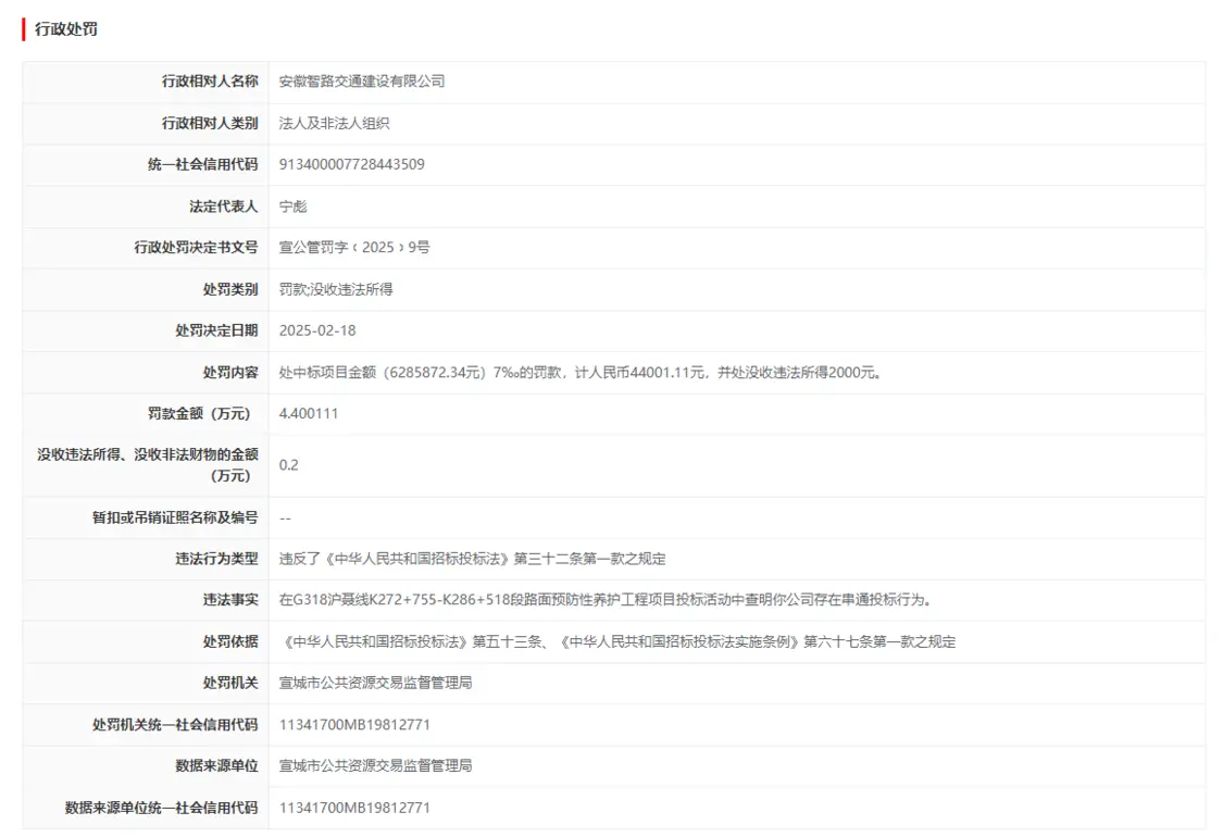 安徽智路交通建设有限公司被处中标项目金额(6285872.34元)7‰的罚款,计人民币44001.11元,并处没收违法所得2000元。