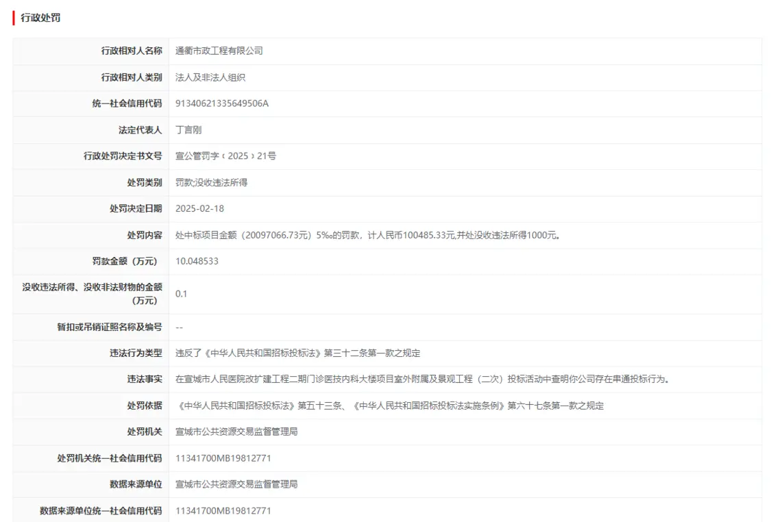 公开处罚信息显示,在宣城市人民医院改扩建工程二期门诊医技内科大楼项目室外附属及景观工程(二次)投标活动中上述四家公司存在串通投标行为。 依据《中华人民共和国招标投标法》第五十三条、《中华人民共和国招标投标法实施条例》第六十七条第一款之规定,分别对上述公司作出行政处罚: 对通衢市政工程有限公司处中标项目金额(20097066.73元)5‰的罚款,计人民币100485.33元,并处没收违法所得1000元;