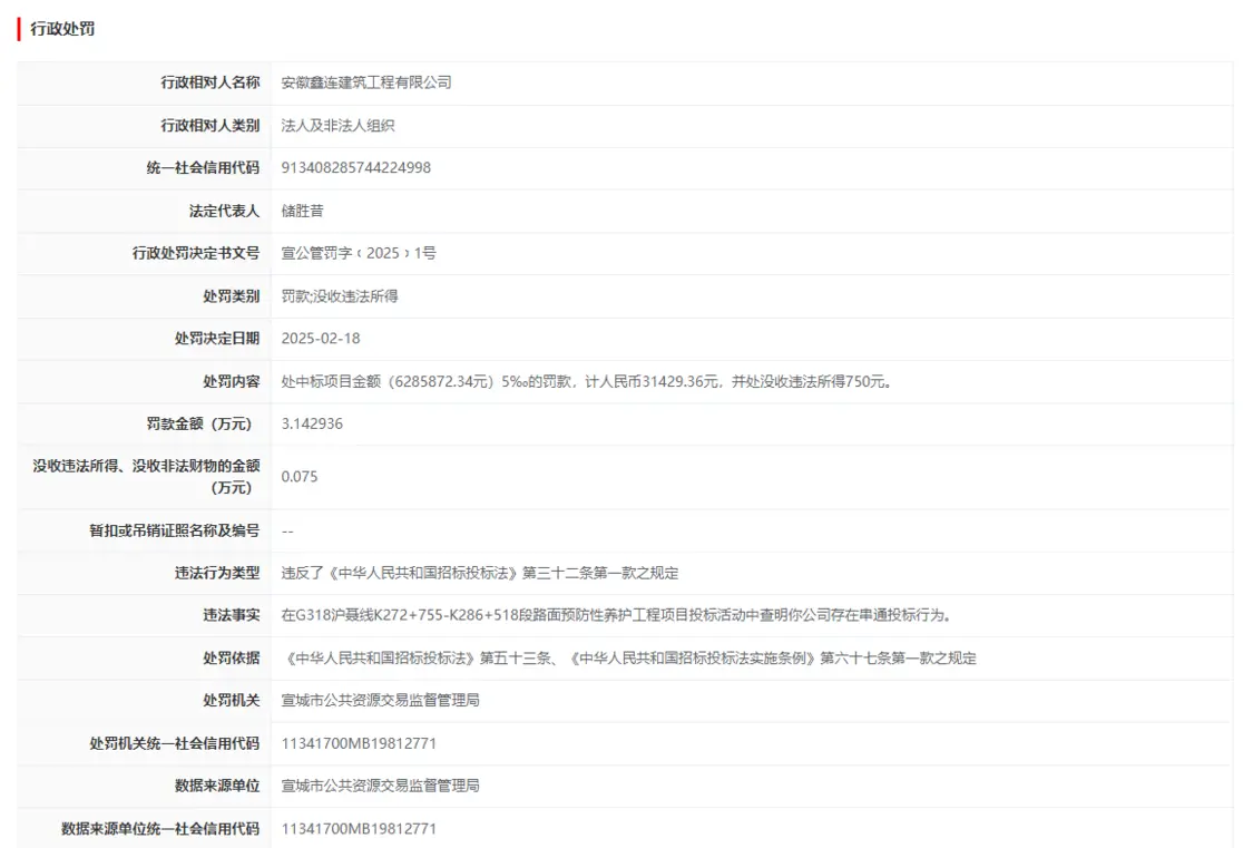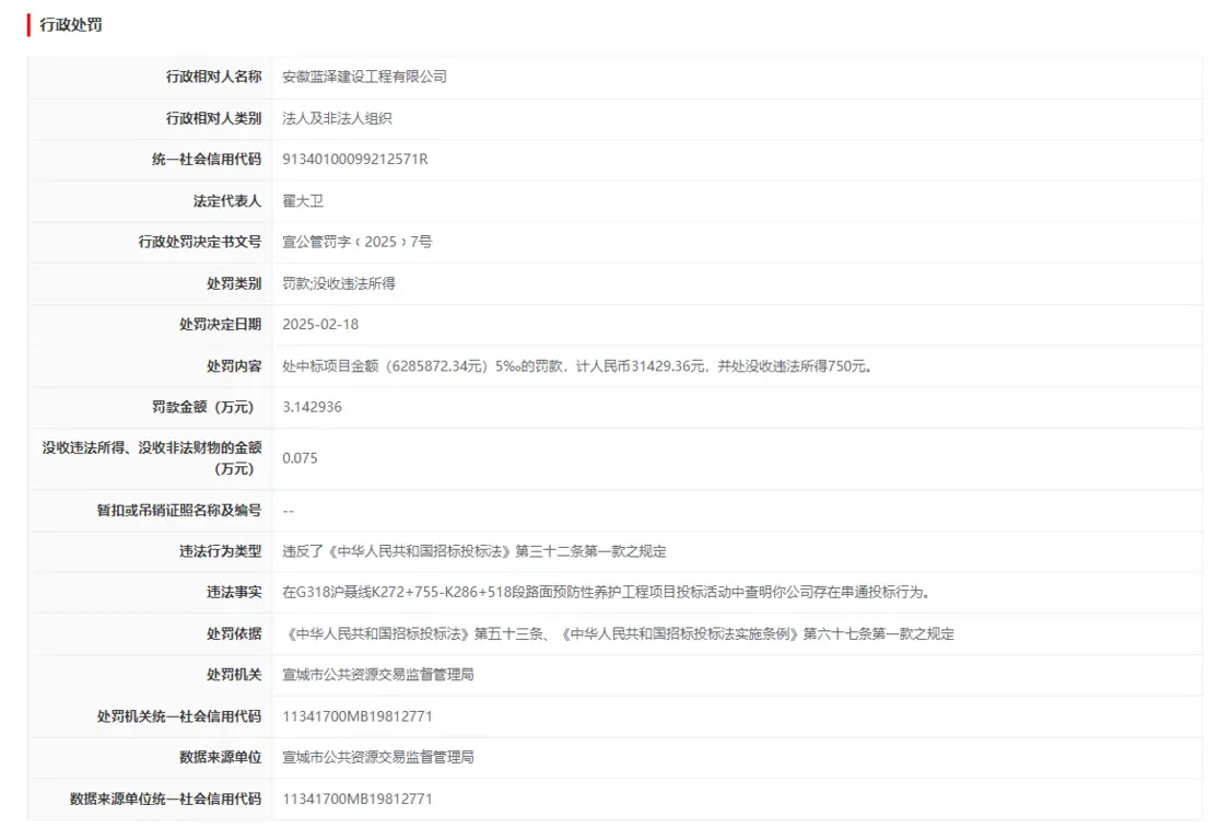 安徽蓝泽建设工程有限公司被处中标项目金额(6285872.34元)5‰的罚款,计人民币31429.36元,并处没收违法所得750元。
