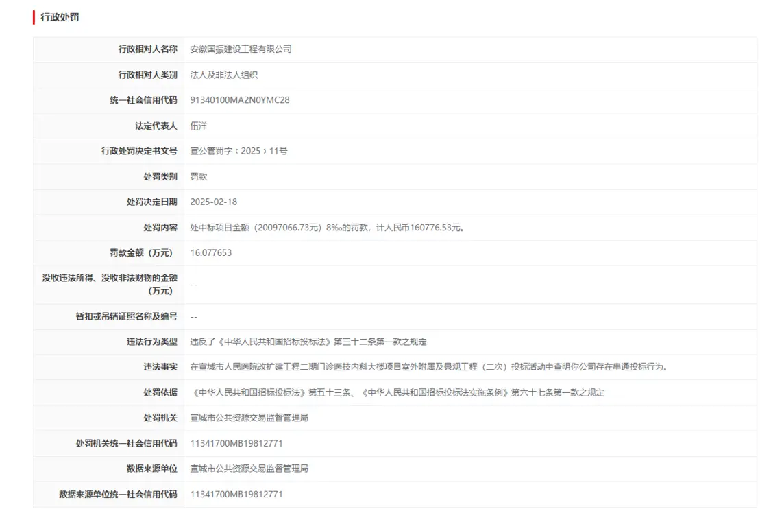 对安徽国振建设工程有限公司处中标项目金额(20097066.73元)8‰的罚款,计人民币160776.53元;