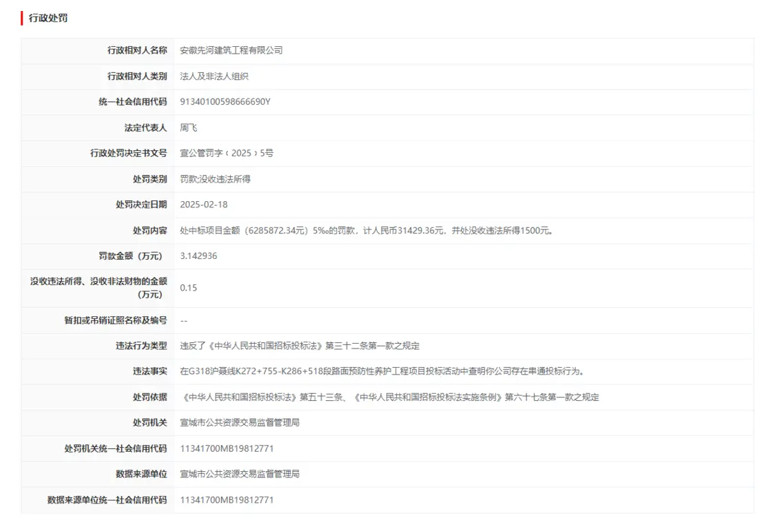 安徽先河建筑工程有限公司被处中标项目金额(6285872.34元)5‰的罚款,计人民币31429.36元,并处没收违法所得1500元。