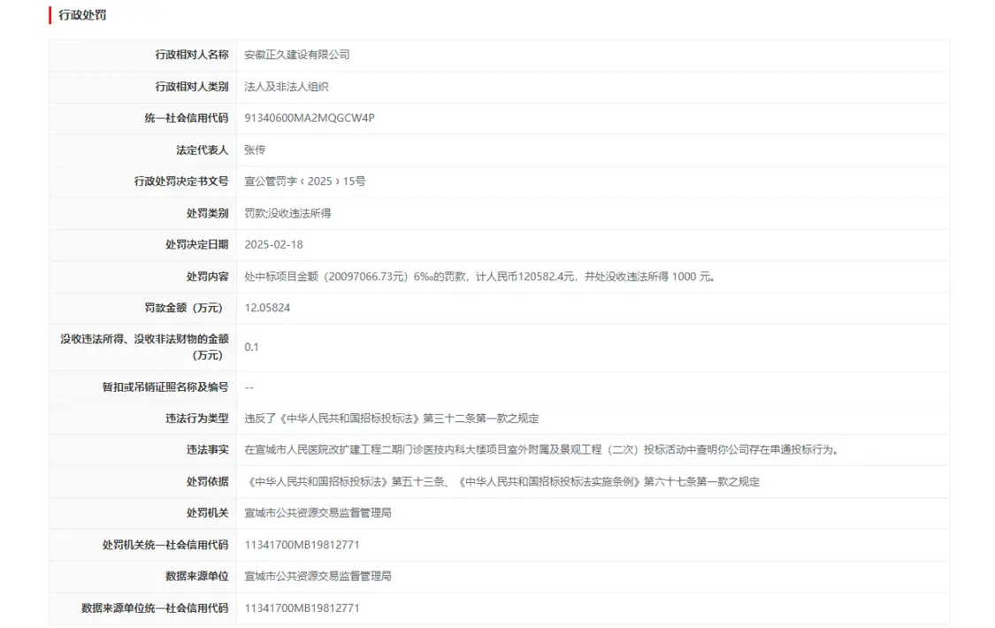 对安徽正久建设有限公司处中标项目金额(20097066.73元)6‰的罚款,计人民币120582.4元,并处没收违法所得 1000 元。