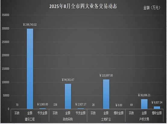 2025年8月,全市公共资源交易完成325宗,成交金额54.17亿元,增收金额9837.34万元,节支金额5992.17万元,增收节支金额合计1.58亿元,其中:建设工程交易项目成交70宗,成交金额29.97亿元,节支金额3065.00万元;政府采购成交158宗,成交金额9.44亿元,节支金额2927.17万元;土地与矿业交易成交28宗,成交金额11.07亿元,无增收金额;产权交易成交69宗,成交金额3.69亿元,增收金额9837.34万元。